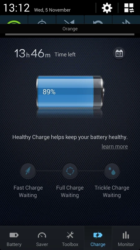 Charge : préservez la santé de votre batterie grâce aux conseils de la section Charge, qui affiche également le niveau de batterie restant et des astuces pour une charge rapide, une charge complète ou une charge d'entretien. Cette fonctionnalité propose une icône Calendrier pour consulter l'historique de charge mensuel.